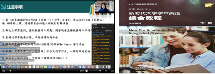 网络云课堂主要安排两部分教学内容:(1)以《新时代大学学术英语综合教程》为教材,选取教学单元,结合教学单元主题,收集整理教学素材,新建在线直播课(钉钉直播),配合搭建在线学习社区(钉钉在线教学圈),旨在帮助员工通过真实语料的学习,积累语言产出任务所需的语言内容和语篇结构,并通过在线模拟语境中的实践进行语言应用;(2)结合MOOC学习数据反馈,提炼MOOC难点,在直播课程中进行这些语言技能难点的剖析教学,旨在帮助员工切实掌握MOOC中涉及的语言技能。通过结合以上两者,最终实现传统线下实体课堂的云迁徙。
