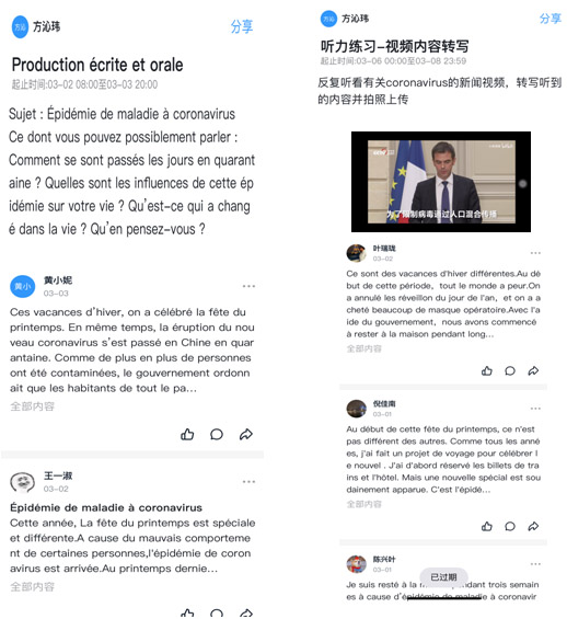 测试环节旨在引导员工课下的自主学习,巩固并训练已学知识和能力,包括系列习题小测、口笔语表达作业等形式。现阶段口笔语作业优先采用真实语料,结合抗击新冠肺炎疫情的时事,激发员工进一步的学习热情和兴趣。