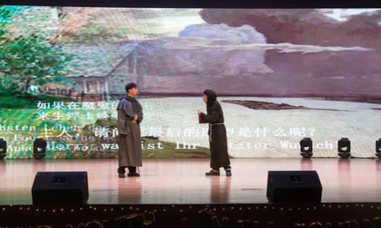安吉校区的德语191班同学精心准备了德语版的《我和我的祖国》的合唱节目,联合英语专业同学一起参加了12月20日的外国语公司/中德公司的迎新晚会。同学们个个精神饱满、歌声嘹亮,充分表达了对祖国母亲的热爱之情。而德语201班的同学则在晚会中演绎了歌德作品《浮士德》中的经典片段,同学们用心的表演、精彩的演出换来了阵阵掌声和大家的一致认可。