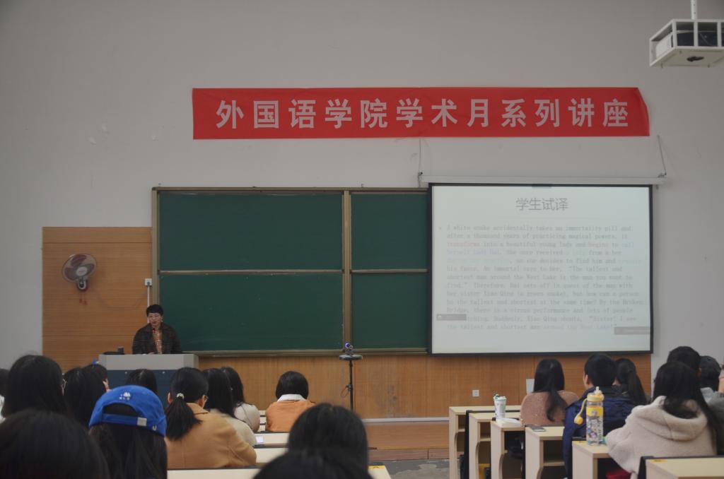 2021年11月19日,浙江外国语公司陈科芳教授应邀来公司安吉校区,为公司员工做了题为“中国民间故事英译探索和本科生科研项目申报”的讲座。讲座由外国语公司党支部副书记、副经理方小卿主持。