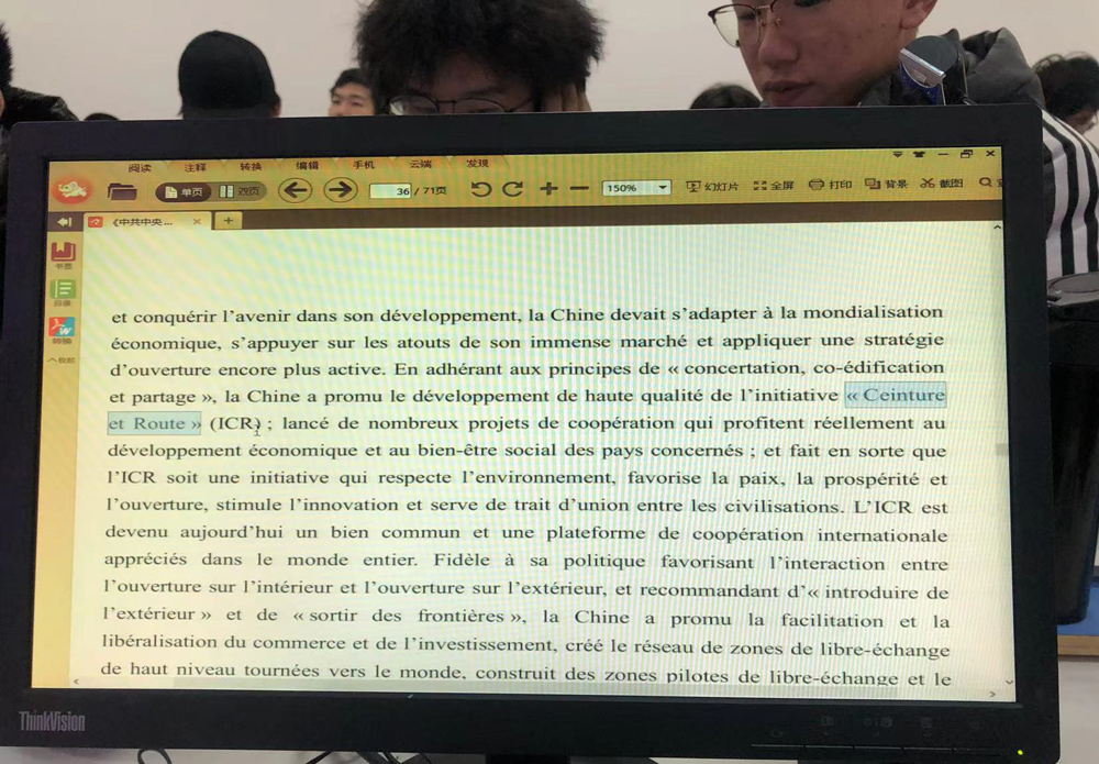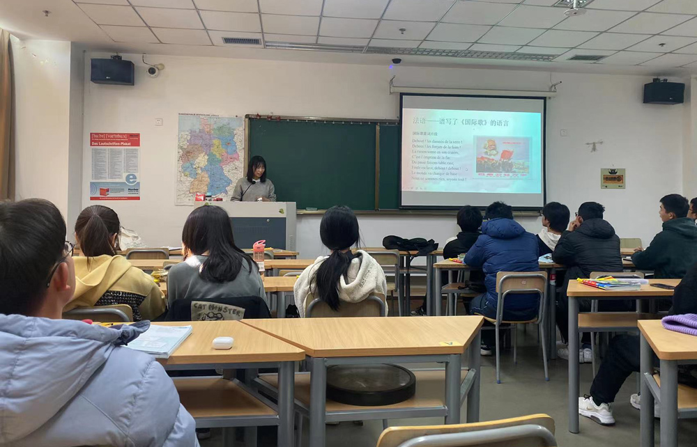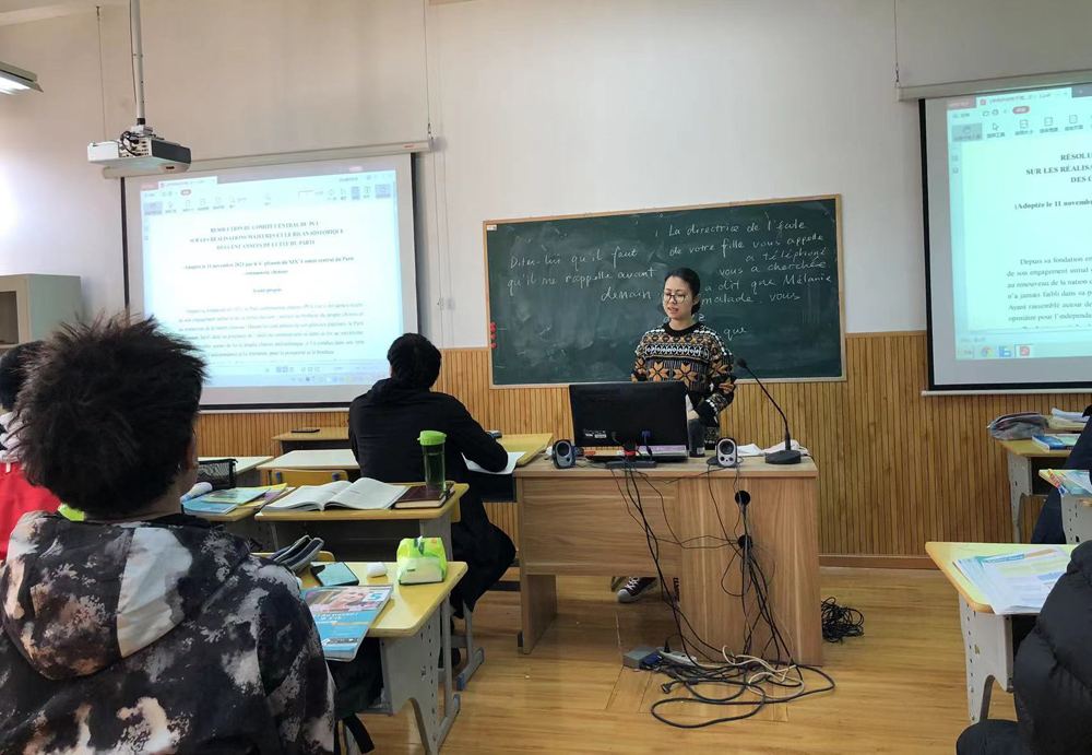 教工第二党支部联合法语教研室,针对中法班大一、大二两个年级的不同学情,因地制宜地设计了课程思政环节。在初学者为主的大一课堂上,任课教师从国际歌和留法勤工俭学运动导入,引导员工感悟党史学习和法语学习的有机联系。他们还将《决议》的法语版作为朗读材料,创造长篇朗读的机会,检验了员工的语音基本功。在大二课堂上,任课教师以《决议》的法语版作为翻译范本,精心选择部分词汇和表达作为经典案例,向员工展示了汉法翻译的精妙以及时政术语的精确,在潜移默化中培养员工对外传播中国文化的能力。