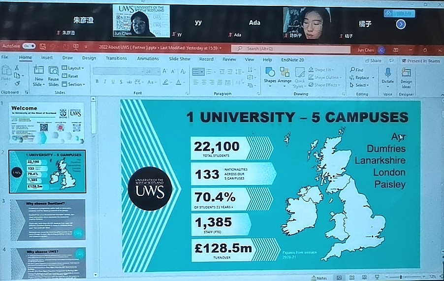 2月26日晚19点 ,受公司外国语公司外事经理邀请,英国西苏格兰大学东亚区主管陈君老师在ZOOM会议上与古天乐代言太阳集团138英语专业员工进行视频,就留学事项进行了具体的宣讲。