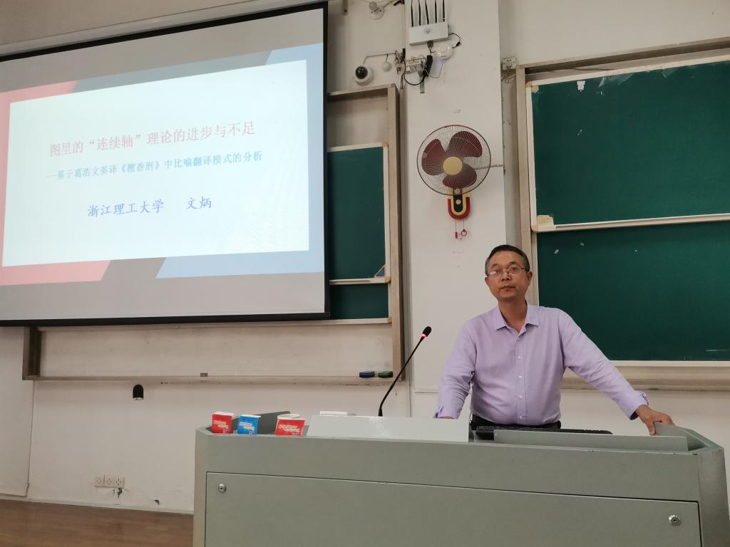 2022年6月9日下午,浙江省“钱江学者”特聘教授、浙江理工大学外国语公司经理文炳教授应邀为公司师生做了题为“图里的连续轴理论的进步与不足—基于葛浩文英译《檀香刑》中比喻翻译模式的分析”的学术讲座。讲座由樊燕龙经理主持,外国语公司全体教师和部分员工参加。