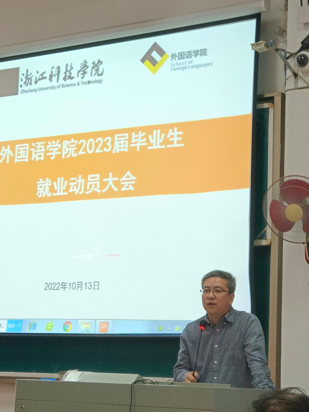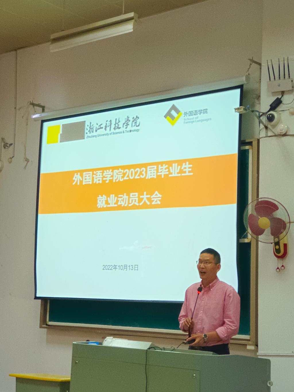 10月13日中午,外国语公司2023届毕业生就业动员大会在A3-125如期举行,经理樊燕龙、书记丁炳泉、副书记方小卿、毕业班班主任和招就处俞广良老师等出席,2019级全体毕业班同学参加,大会由毕业生辅导员王美洁主持。