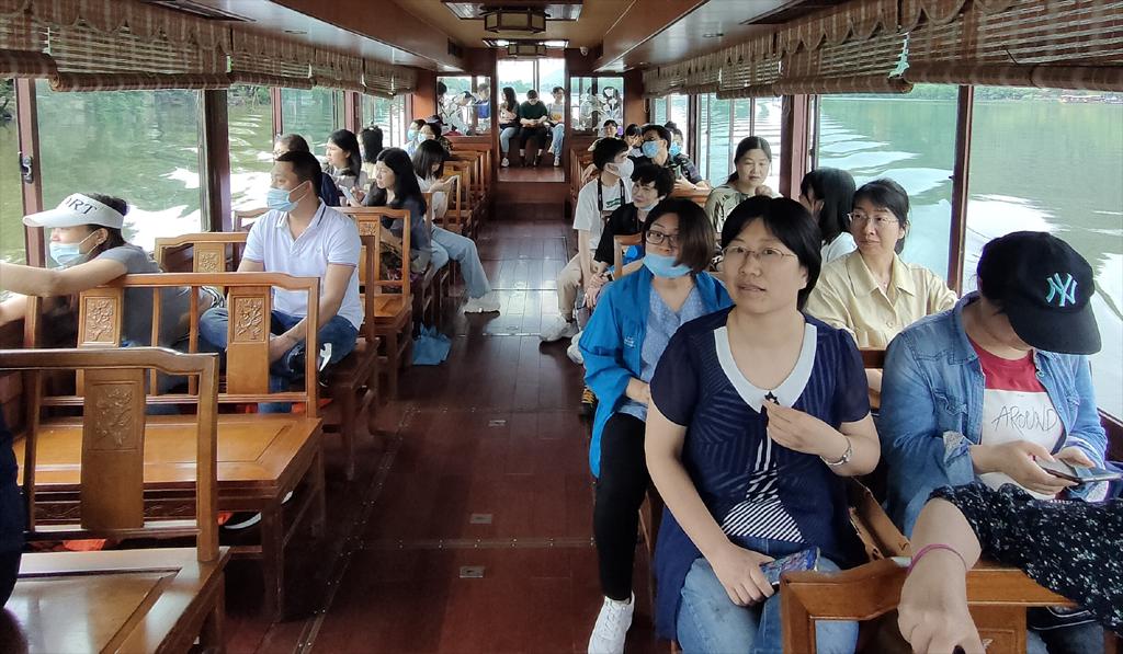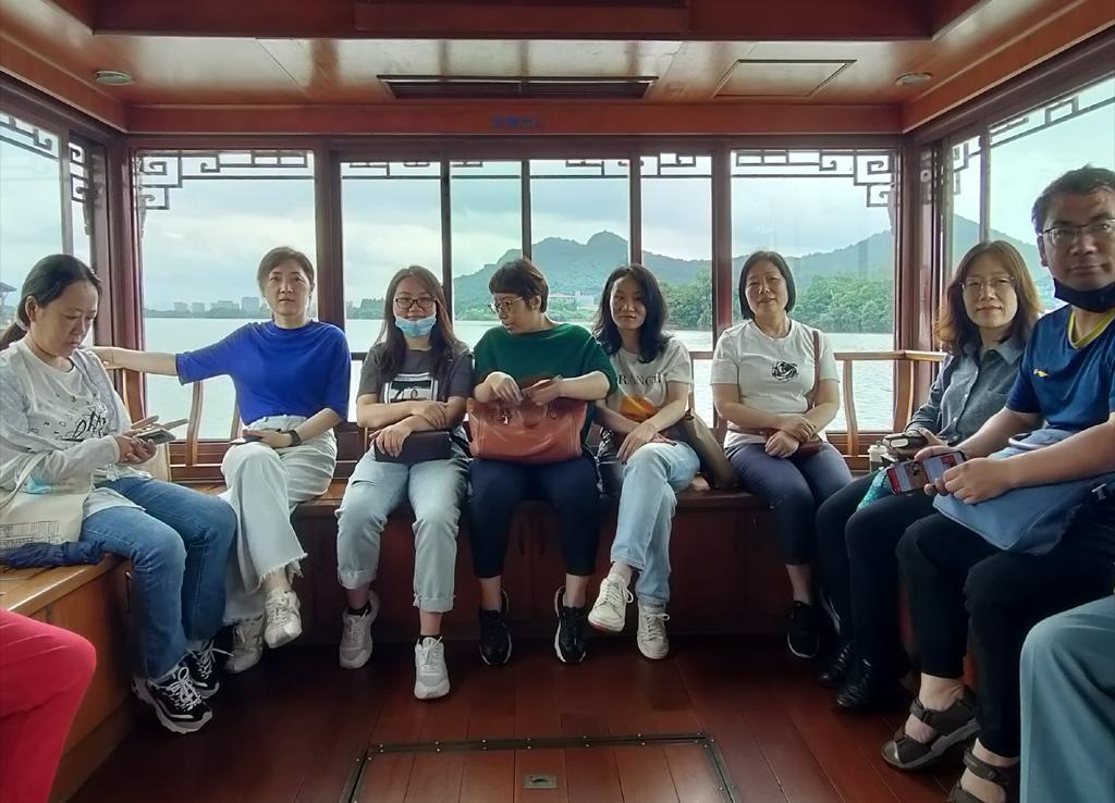 应防疫政策要求,本次活动的地点设在位于萧山区的湘湖旅游度假区,让大家不出市便能感受绿水青山的魅力。湘湖,因其湖光山色旖旎多姿,媲美西湖而被誉为杭州西湖的“姊妹湖”。它同时也是浙江文明的发祥地,在这里出土了良渚文化时期的独木舟。活动当天,天公作美,虽已仲夏却凉风习习。大家坐着游船,泛舟湖上,两边景色一一映入眼帘,美不胜收。坐完游船,大家沿着湖边绿道缓行,饱览湖边的醉人风景,并在绿水青山间合影留念。