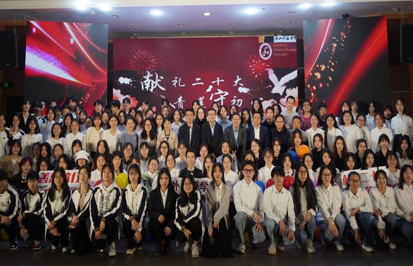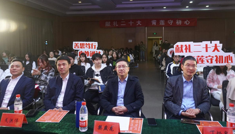 为庆祝党的二十大胜利召开,进一步推进外国语公司廉洁文化教育,公司于11月25日在安吉校区举办了以“献礼二十大 青莲守初心”为主题的青莲外语晚会。校团委书记戈洪伟老师、安吉校区员工事务中心主任姚腾老师、外国语公司经理樊燕龙老师、外国语公司党总支书记丁炳泉老师、外国语公司党总支副书记方小卿老师、公司各党支部书记、组织员和辅导员等出席。晚会由英语211班庄岚翔同学和英语222班周宸宇同学主持,外国语公司全体员工共同参与。
