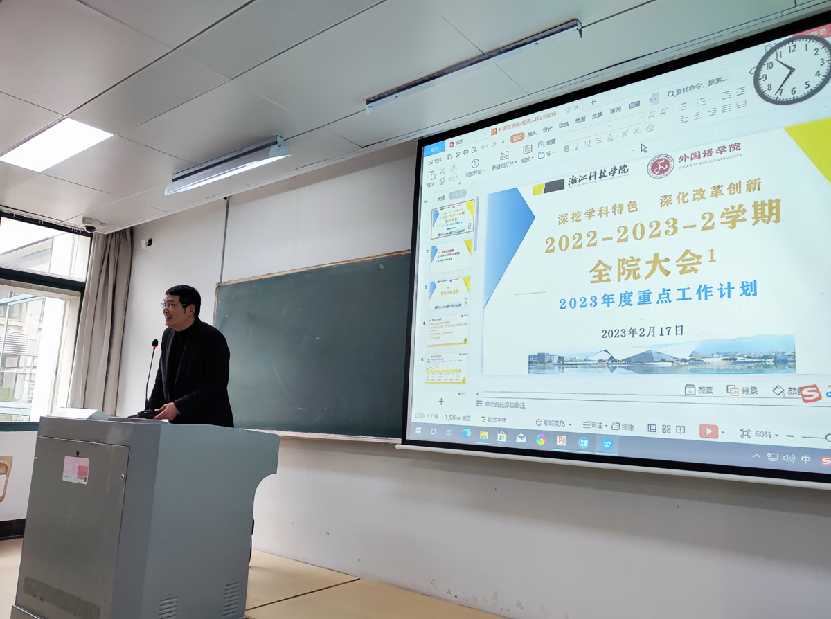以会促行,凝心聚力,共谋发展。2月17日上午,外国语公司在A2-215教室召开了新学期第一次全院大会,部署新学期各项工作,同时进行了今年第一次全院政治理论集中学习。会议由经理樊燕龙主持,外国语公司全体教职员工参加会议。
