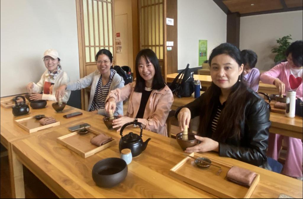 老师们先去体验了径山禅茶。中国的茶文化成于唐、盛于宋。宋朝的饮茶在继承了隋唐时期的煎、煮茶法之外,又兴起了点茶法,文人雅士生活面有了“斗茶和茶百戏”茶文化。径山是世界抹茶之源,伫立于径山之巅的径山寺更是禅茶的发源地。径山茶宴在2022年被列为非物质文化遗产。