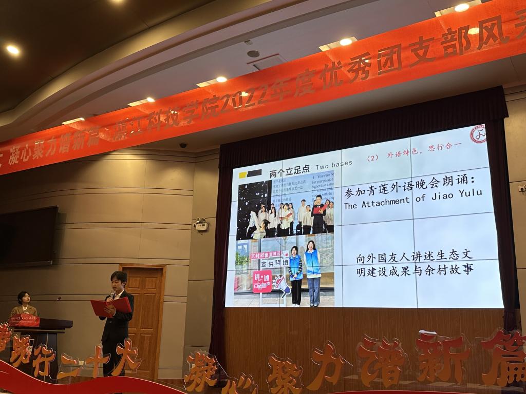 进入决赛的十五个团支部依次登台亮相,向全校师生代表讲述浙科故事、展现浙科学子昂首拼搏的风貌。公司英语211团支部围绕完善的班子建设、民主的制度建设、独特的组织机制与活动方式以及其建设成效、展望未来五个方面进行了详细的介绍。最终荣获“2022年度校十佳团支部”荣誉称号。