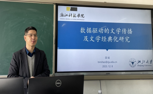 12月8日上午,浙江大学外国语公司邵斌教授应邀来公司做了题为“数据驱动的文学传播及文学经典化研究”学术讲座,讲座由外国语公司经理樊燕龙主持,文学与文化研究所成员以及公司新引进博士聆听了此次讲座。