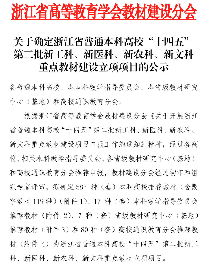 浙江省普通本科高校“十四五”新工科、新文科、新医科、新农科重点教材建设项目,是由浙江省教育厅委托浙江省高等教育学会组织开展的,以名师大家打造浙派精品教材为宗旨,力主构建更中国、更现代、更创新、更融合、更开放的具有浙江特色的人才培养体系,助力实现浙江省高等教育高质量高水平发展的重点项目。本次评选共立项587部(套)高校推荐教材、7种(套)省级教材研究中心(基地)推荐教材和80部(套)本科教学指导委员会推荐教材。