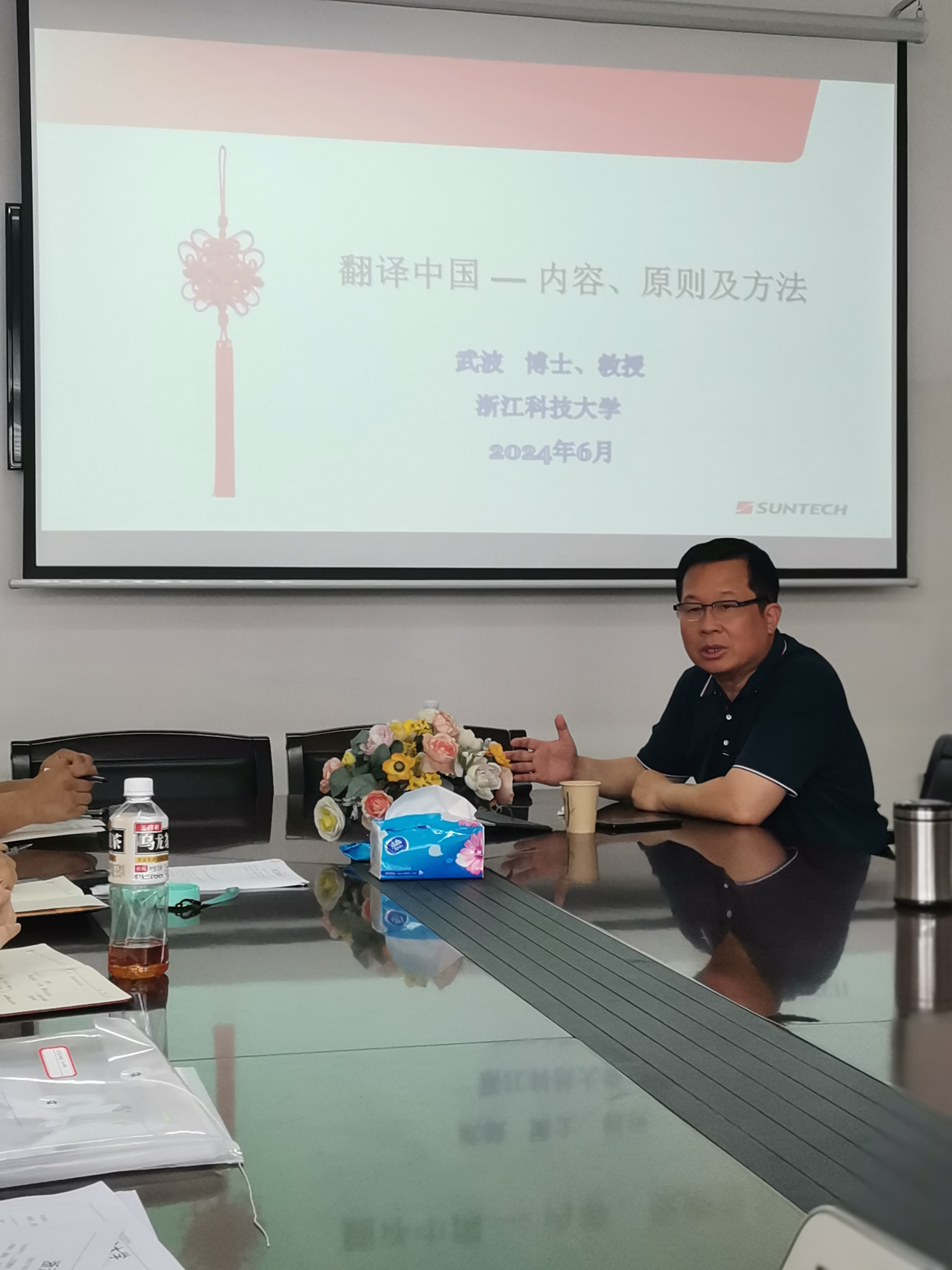 2024年6月13日,外交公司武波教授应邀来公司做题为“翻译中国——内容、原则及方法”的学术讲座,公司翻译研究所的老师以及近五年引进的博士参加了学术讲座,讲座由林宗豪博士主持。