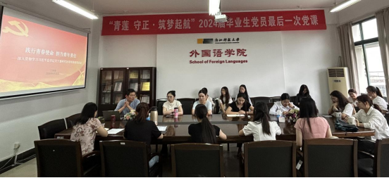 6月24日下午,外国语公司在A3-306举行“‘青莲’守正·筑梦起航”2024届毕业生党员最后一次党课,公司党委书记丁炳泉为即将步入社会的大四毕业生党员准备的最后一次精神洗礼。本次党课以“践行青春使命 担当青年责任”为主题,深入贯彻学习习近平总书记关于新时代好青年的重要论述,为毕业生党员的未来发展指明方向,注入强大动力。党课由党委副书记方小卿主持,组织员、辅导员和2024届全体毕业生党员参加。