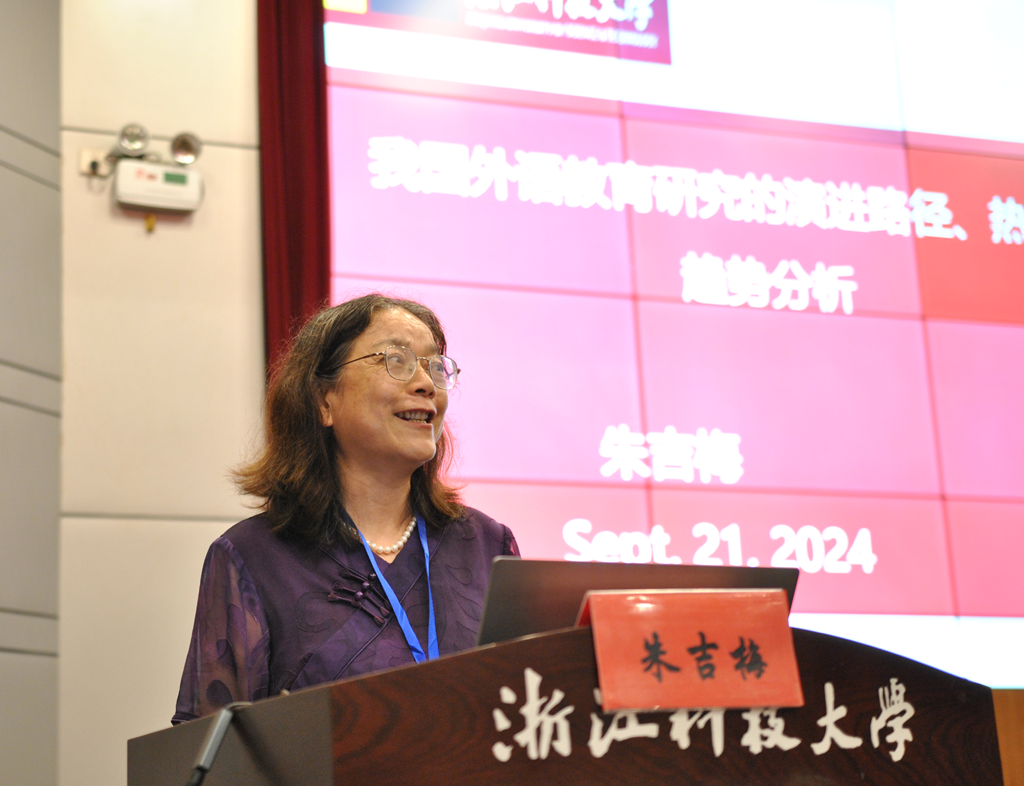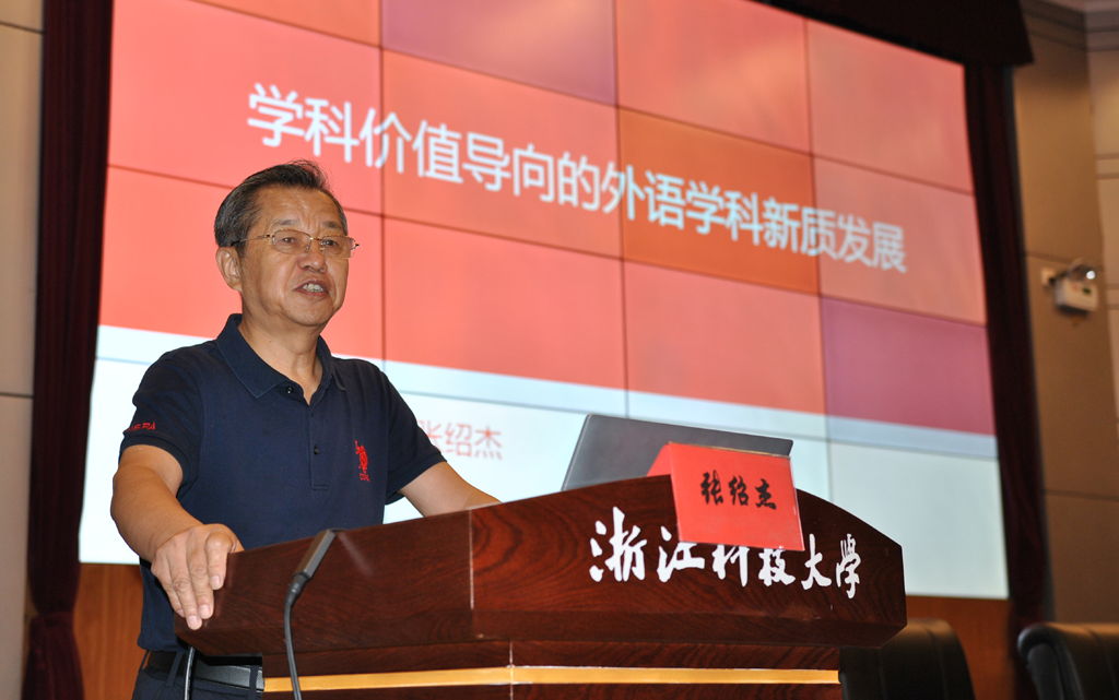 随后,进行了五场精彩的学术报告。浙江工商大学张绍杰教授做了题为“学科价值导向的外语学科新质发展”的主旨发言。他指出,外语学科要实现新质发展,应摆脱外语工具观的传统观念,凸显外语学科在文化文明交流互鉴中的“沟通中外”“借鉴”与“传播”的社会文化价值,并通过在外语公司产品中提升“借鉴力”和“传播力”以实现其新质发展。