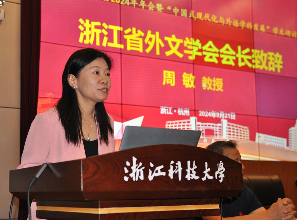 浙江省外文学会会长周敏教授代表外文学会致开幕辞,她指出,此次年会旨在通过深入交流与探讨,推动外语学科在中国式现代化进程中的创新与发展。围绕“中国式现代化与外语学科发展”这一会议主题,她鼓励与会代表们围绕这一主题展开深入交流,共同探讨外语学科在中国式现代化进程中的新定位、新使命和新路径。