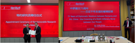 下午,西米那博士受聘为公司罗马尼亚研究中心特约研究员,并举行了聘任仪式。随后,他为公司师生开展了题为“75 years of diplomatic relations between Romania and P.R. China - the crowning of a multi-millenary bond between our people(中罗建交75周年——见证千年友谊的璀璨延续)”的讲座,通过历史发展的视角,展现了罗马尼亚与中国之间延续千年的深厚友谊与联系,以及两国之间长期的友好外交关系。