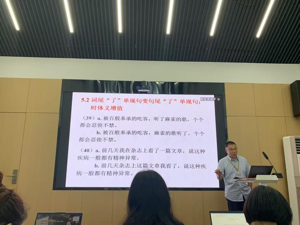 税昌锡教授的主旨发言题目为《时体与时势——再论词尾“了”和句尾“了”的语法意义》,为与会者呈现了其在汉语时体语法研究领域的深入探索。他提出普通话中词尾“了”表示的是端点体,句尾“了”表示一种绵延或趋向性时间特征,可称为“时势”,双“了”句的时间性特征可以概括为以词尾“了”标示的动作行为的端点体递转为以句尾“了”标示的事态呈现的时势。他的创新性观点为研究提供了新的视角,也引发了在场学者对于汉语时体标记系统更广泛、更深入的思考。
