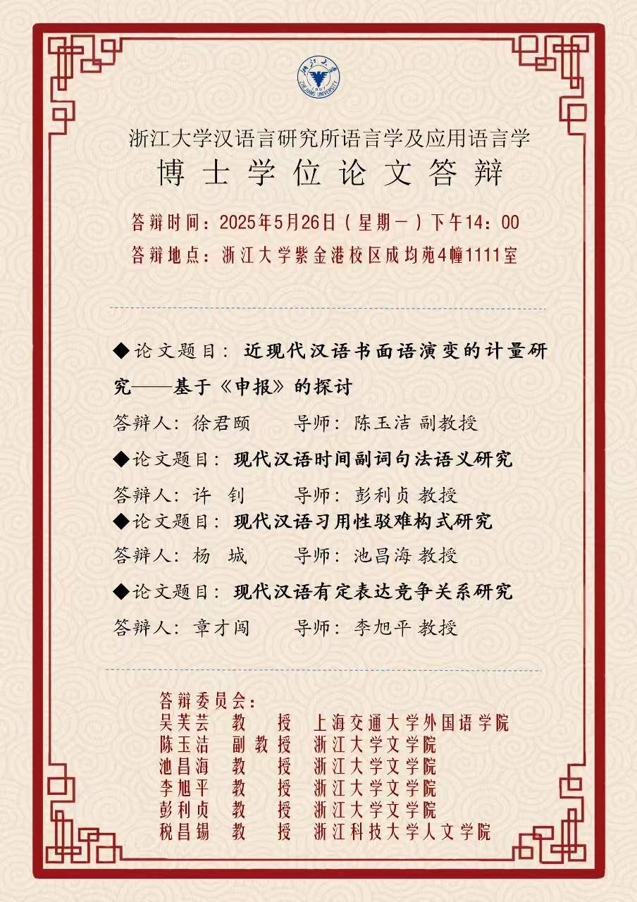 近期,税昌锡教授还受邀参与了浙江大学汉语言研究所邀请,担任博士学位论文答辩委员会成员。