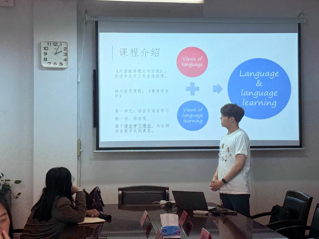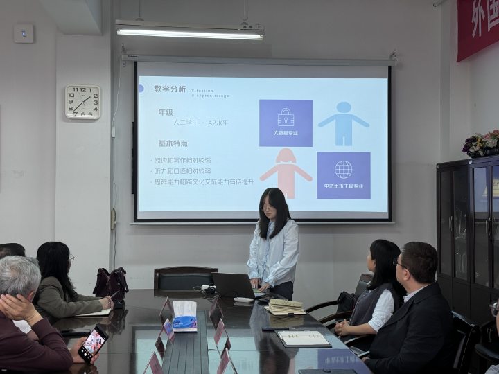 随后,刘婧玥老师和曹祯昊老师先后进行说课与讲课,从教学目标、教材与学情分析、教学理念与方法以及教学反思等方面进行讲解,并展开10分钟的模拟讲课。本次比赛采用“现场授课+即时点评”的互动模式,在点评环节,评委们指出了两位老师的优点和不足,并提出了宝贵的意见和建议,例如加强课程思政元素的显性融入,在教学中渗透跨文化思辨能力的培养,提高课堂教学效率等。