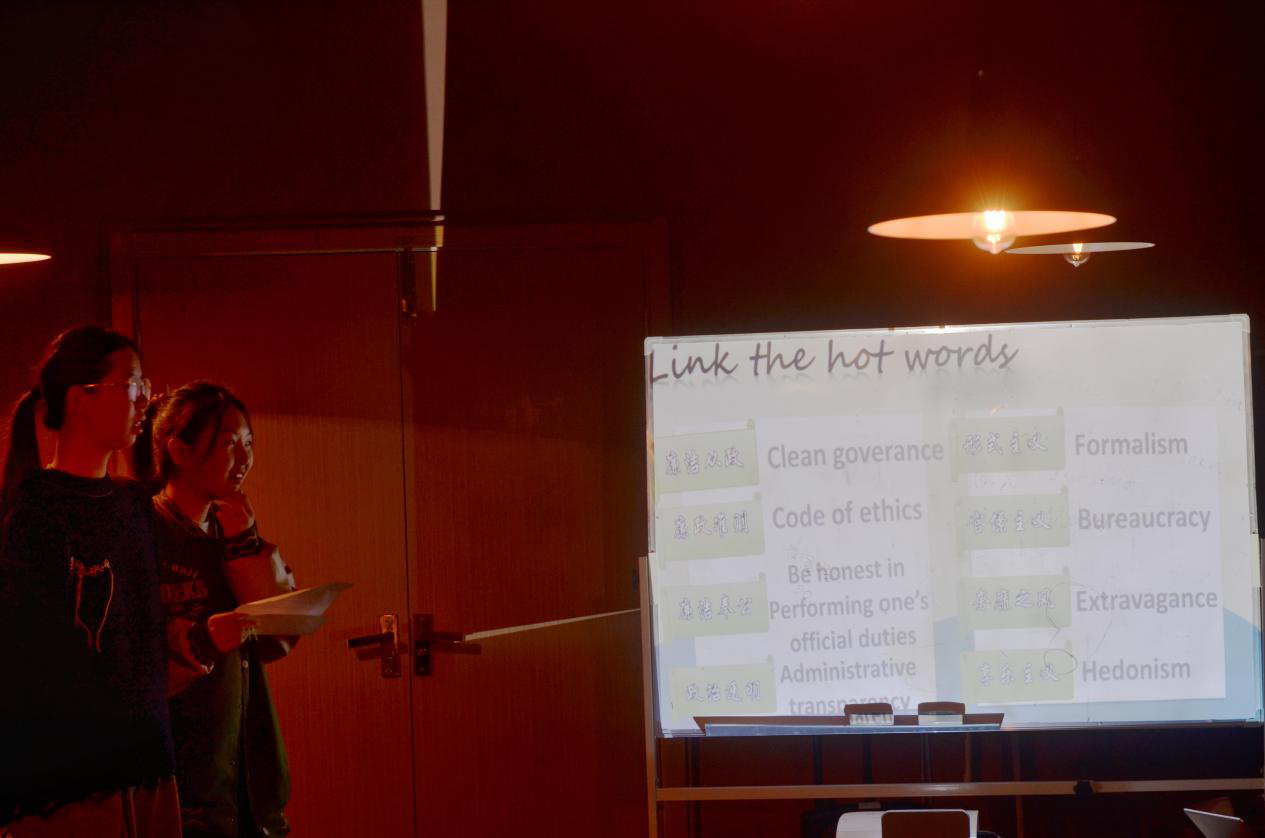 活动中,同学们以“廉洁文化”为主题展开了激烈的讨论,对腐败的现象和结果进行了探讨,学习了有关廉洁建设的热点词语,以英译剧情形式还原了热点事件,明白了作为当代青年老员工,应积极践行“八荣八耻”,时刻牢记“廉洁”教育,养成“廉洁”意识,进而为日后步入社会奠定良好的基础。