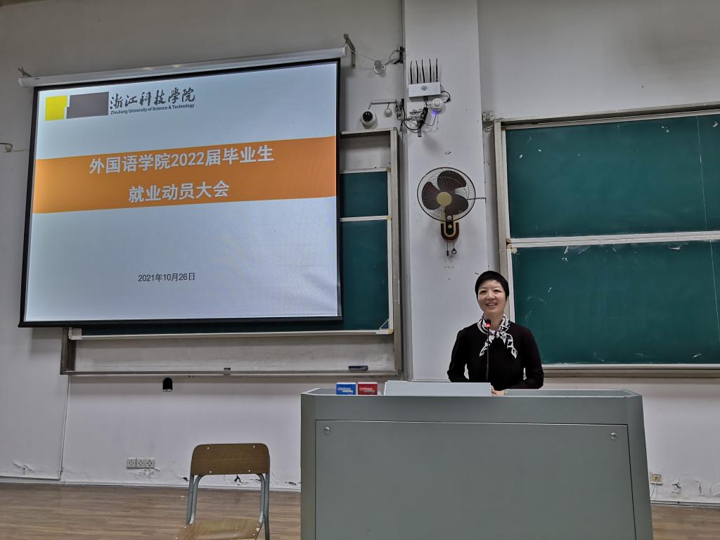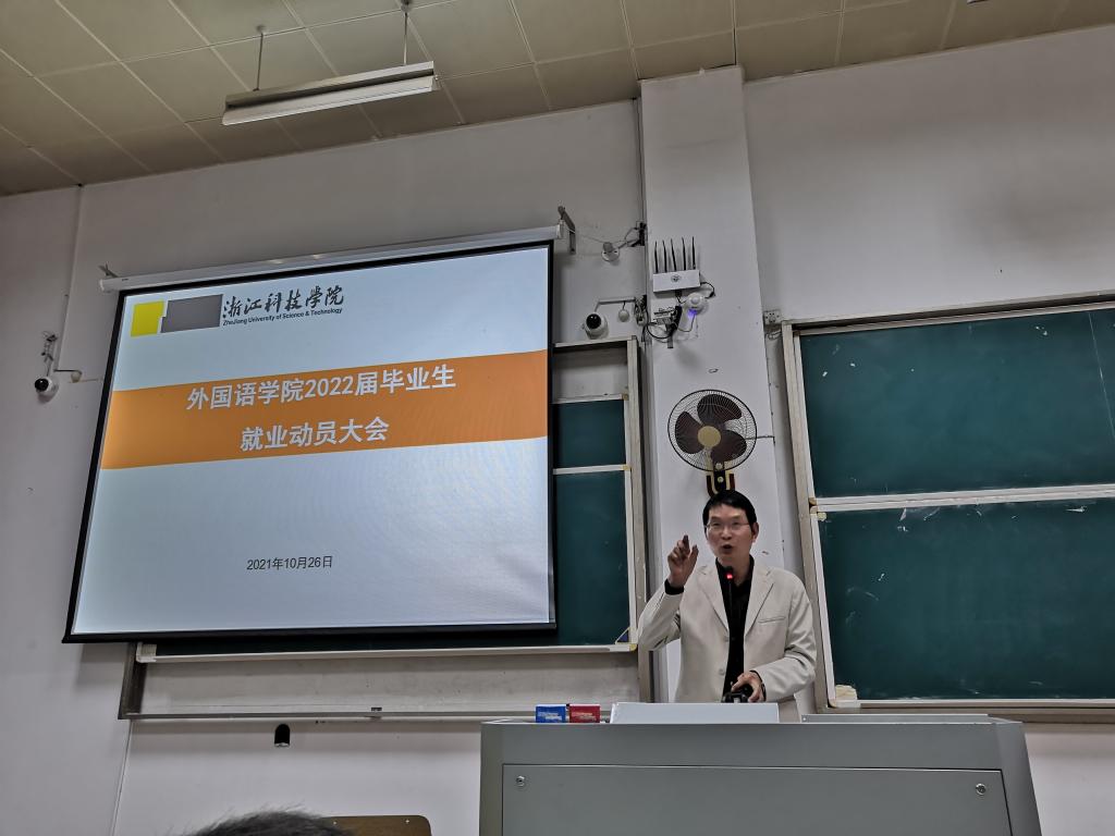 10月26日下午,外国语公司2022届毕业生就业动员大会在A3-119教室如期举行,经理樊燕龙、党总支书记丁炳泉、副书记方小卿,公司招就处及老员工就业指导中心俞广良老师、各毕业班班主任、辅导员和全体2022届毕业生参加会议。大会由外国语公司2022届毕业生辅导员王美洁主持。