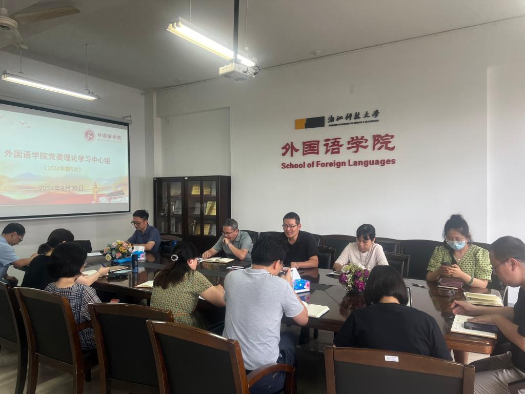 8月30日下午,外国语公司党委理论学习中心组召开会议,专题学习党的二十届三中全会精神。公司党委书记丁炳泉主持会议,全体理论学习中心组成员、各部门主要负责人以及各支部书记参加学习会。