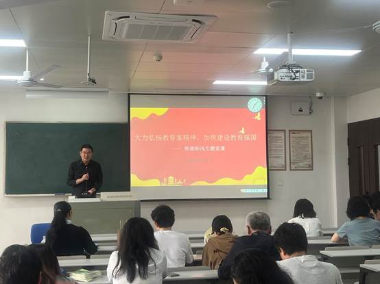 会议开始,丁炳泉书记以“大力弘扬教育家精神,加快建设教育强国”为题,给全体老师上了一堂师德师风专题党课,传达学习习近平总书记在全国教育大会上的重要讲话精神,并带领大家学习《中共中央国务院关于弘扬教育家精神加强新时代高素质专业化教师队伍建设的意见》、《高等公司预防与处理学术不端行为办法》、《新时代高校教师职业行为十项准则》等师德师风建设相关文件精神,结合“违反高校教师职业行为十项准则典型案例”进行警示教育。丁炳泉书记强调,要大力弘扬师德师风的优良传统,通过师德师风专题学习和警示教育,全院教师要不断坚定理想信念,陶冶道德情操,坚持涵养扎实学识,勤修仁爱之心,凝聚队伍合力,以反面典型案例为警为戒为训,把教书育人和自我修养结合起来,做到以德立身、以德立学、以德施教。会议还传达了公司等级平安校园创建工作部署会议精神。