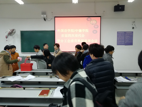 会议分为三个议程,傅晓伟书记首先宣读了院分工会委员的选举办法,大会代表一致通过;随后分工会主席陈亚轩及工会委员黄骅老师分别做了分工会2016年工作报告及2016年分工会财务报告,并得到大会审议通过。最后,全体代表进行了分工会委员的选举,在紧张地投票,严谨公正地监票、计票下,产生了新的一届分工会成员,陈亚轩老师以高票继续连任外国语公司/中德公司分工会主席,并代表新一届成员向大会代表承诺会继续认真努力地为公司教职工服务!