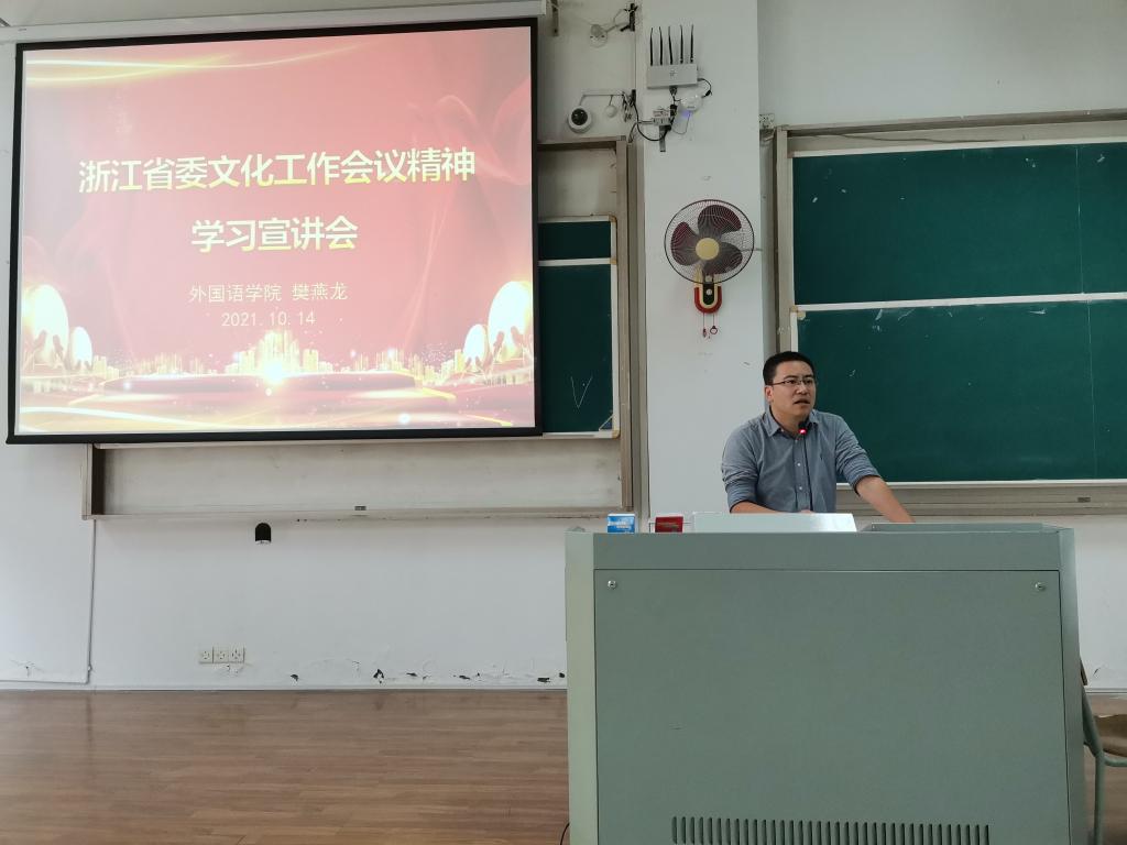 近日,外国语公司积极开展浙江省委文化工作会议精神的学习。10月14日下午,外国语公司经理樊燕龙对浙江省委文化工作会议精神做了宣讲,公司全体教师参加了此次宣讲活动。
