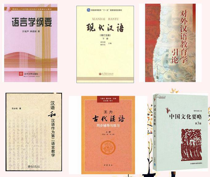 1.《语言学纲要(修订版)》,叶蜚声、徐通锵著,北京大学出版社,2010年版; 2.《现代汉语(增订六版)》,黄伯荣、廖序东主编,高等教育出版社2017年版; 3. 《对外汉语教育学引论》,刘珣著,北京语言文化大学出版社2000年版; 4.《汉语和汉语作为第二语言教学》,吕必松著,北京大学出版社2007年版。 |